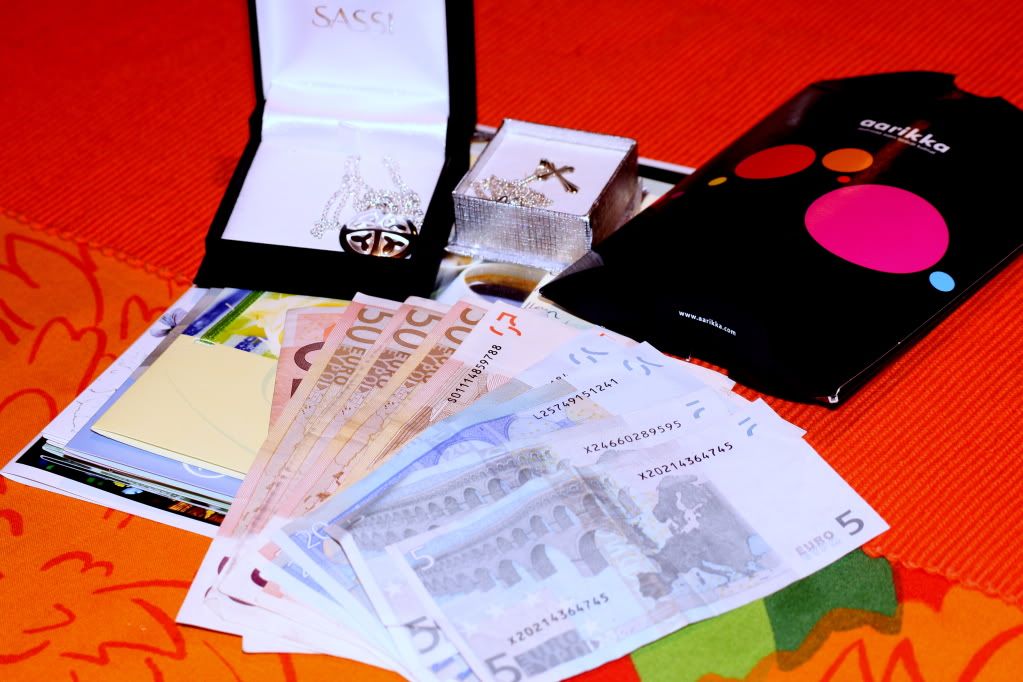 Lisäksi tossa kuvassa on aarikan paketissa sellainen lila käsikoru, joka on myös aika hieno, muttei ihan mun tyylinen kuitenkaan, että tuskin tulen sitä kauheasti pitämään. Ja sitten niihin rahoihin. Kuvassa on rahaa vain 400€, vaikka sain oikeasti 2200€, 1600€ niistä on sellaisella tilillä, minkä saan vasta kun täytän kahdeksantoista, mutta se on mulle ihan ok, koska olisin kuitenkin suurimman osan rahoista pistänyt säästöön ja tehnyt jonkinlaisen säästötilin, niin nyt säästyn siltäkin vaivalta kun mulla on tuo tili. Sitten vielä tosta summasta 200€ sain äidiltä, ja se on mun tilillä jo. Varmaan pistän 300€ vielä tonne omalle tililleni, ja käyttörahaksi otan vaan ton 100€, jos tulee jotain keikkoja mille haluan mennä, tai sitten vaikka shoppailen sillä rahalla :---)